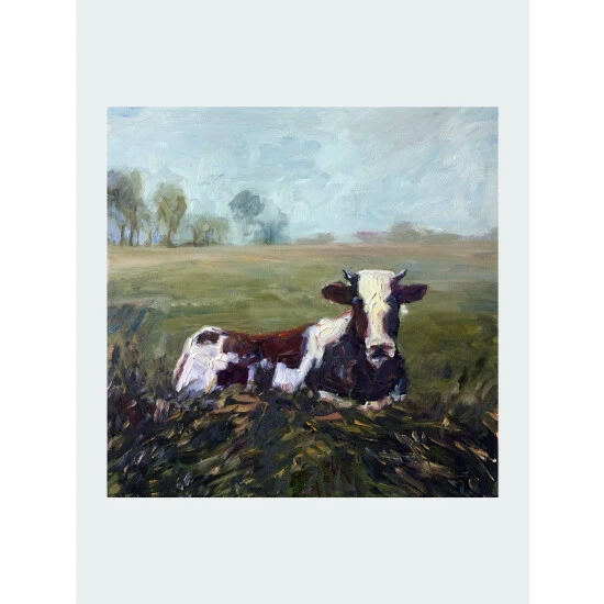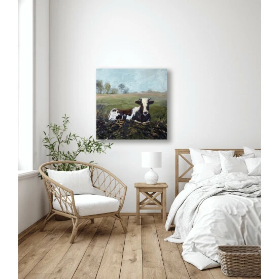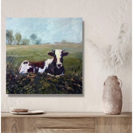 A rustic, contemporary still life of a cow relaxing in the vast pastures in Oklahoma. Artist Enhancement: Johnny himself adds a little acrylic paint on the canvas to create heavy texture.